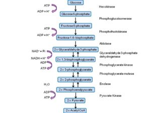 - Glycolysis: this occurs in the cytoplasm of the cells. First, the glucose molecule is phosphorylated by the addition of a phosphate group to the glucose to become glucose-6-phosphate which is carried out by an enzyme known as hexose kinase.