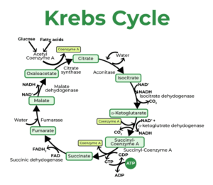 The combination of acetic acid and co-enzyme A forms acetyl-coA. Acetyl-CoA combines with oxaloacetate acid to form citric acid which is an important start of the Kreb’s cycle. Kreb’s cycle takes place in the matrix of the mitochondrion. Most of the ATP is generated in the cycle. The oxidation process in Kreb’s cycle leads to the production of 36 ATPs (18 ATP from each pyruvate).