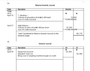 | Apr 30 | Bought weighing machine from Standard Tools Ltd on credit N62,000 |