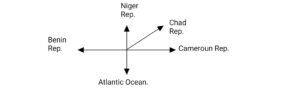 POSITION: The position of Nigeria refers to the intended eras in Africa (West Africa). She is bounded in the North by Niger Republic, in the North-East Chadublic, in the East by Cameroon Republic, in the South by the Anticc Ocean, and west by Benin Republic. Nigeria is bounded by French-speaking (Francophone) West African countries.