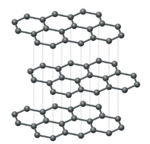 GRAPHITE: The graphite crystal is hexagonal. The carbon atoms in graphite form flat layers. These layers are arranged in parallel, one above the other to form a crystal lattice.