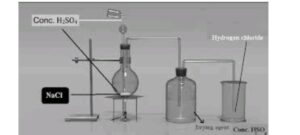 Note: NaHSO4 is first formed at a lower temperature and later at a higher temperature HCl gas is formed. The gas is dried by passing it through concentrated H2SO4 in another flask and collected.