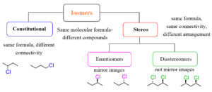 - Stereo Isomerism: This arises as a result of differences in spatial orientation of atoms or groups of atoms about a carbon-carbon double bond or ring structure or a carbon atom surrounded by four different groups.