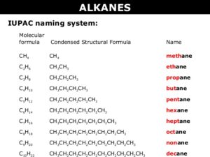 - Root name: Name of the parent aliphatic hydrocarbon of the longest carbon chain in a molecule.