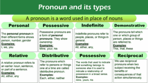 There are different types of pronouns. They are personal pronouns, possessive pronouns, relative pronouns, reflexive pronouns, etc.