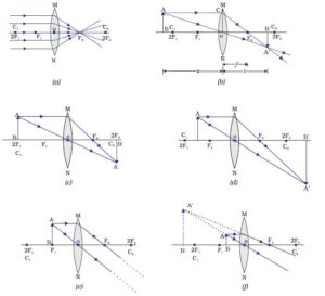 1. A ray from the top of the object incident on the middle, c, of the lens and passes through the lens undefeated.