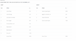 - Profit and Loss account: This is the type of account prepared at the end of the business period, usually a year. By a farmer to know whether his business is making a profit or loss.