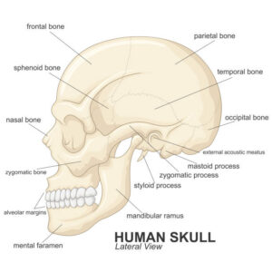 The Skull is made up of flat bones joined together by a suture joint which has three parts: Cranium (brain-box), facial skeleton and the jaws; including maxilla (upper) and mandible.