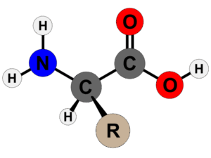 Amino acids are the basic structural units of proteins. Amino acids are organic compounds which contain both an amino group and a carboxyl group, that is, any of a group of organic molecules that consist of a basic amino group (−NH2), an acidic carboxyl group (−COOH). Each molecule contains a central carbon (C) atom, termed the α-carbon, to which both an amino and a carboxyl group are attached. The remaining two bonds of the α-carbon atom are generally satisfied by a hydrogen (H) atom and the R group. The formula of a general amino acid is: