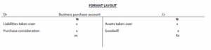 Here, assets, name, and connection of the business will be taken over hence, goodwill must be paid for. For this reason, assets and liabilities will be revalued. The purchaser can assume trade liabilities as part of the consideration. The excess of the purchase consideration over the net value of the asset is called Goodwill. If on the other hand, the purchase consideration is lower than the net assets, the purchaser has gained the advantage of “Capital reserve”. In some cases, he may acquire all the assets without cash and leave the vendor to discharge the liabilities of the business.
