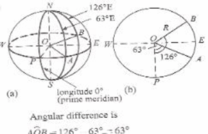 Towns A and B lie on the equator. A has longitude 63° E. While B has longitude 123°E. What is the difference between the two towns along the equator?